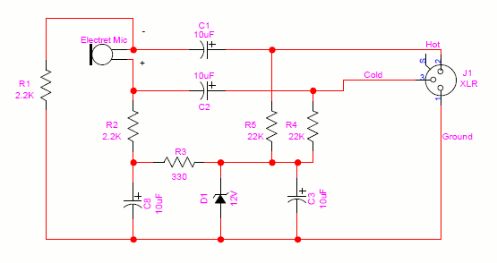 Réalisation du circuit interfaçant une capsule électret vers une entrée de préampli micro symétrique et fournissant une alimentation Phantom en +48V.Schéma trouvé : http://www.epanorama.net/circuits/microphone_powering.html