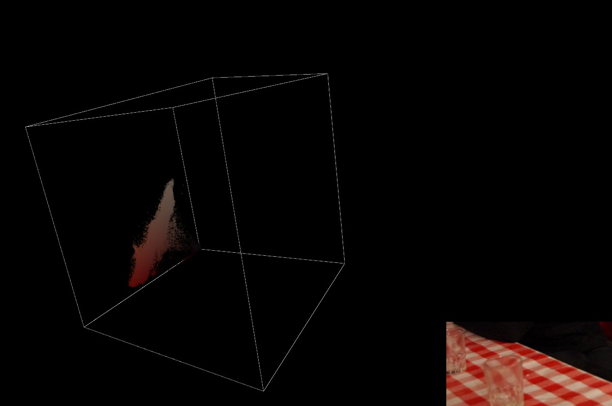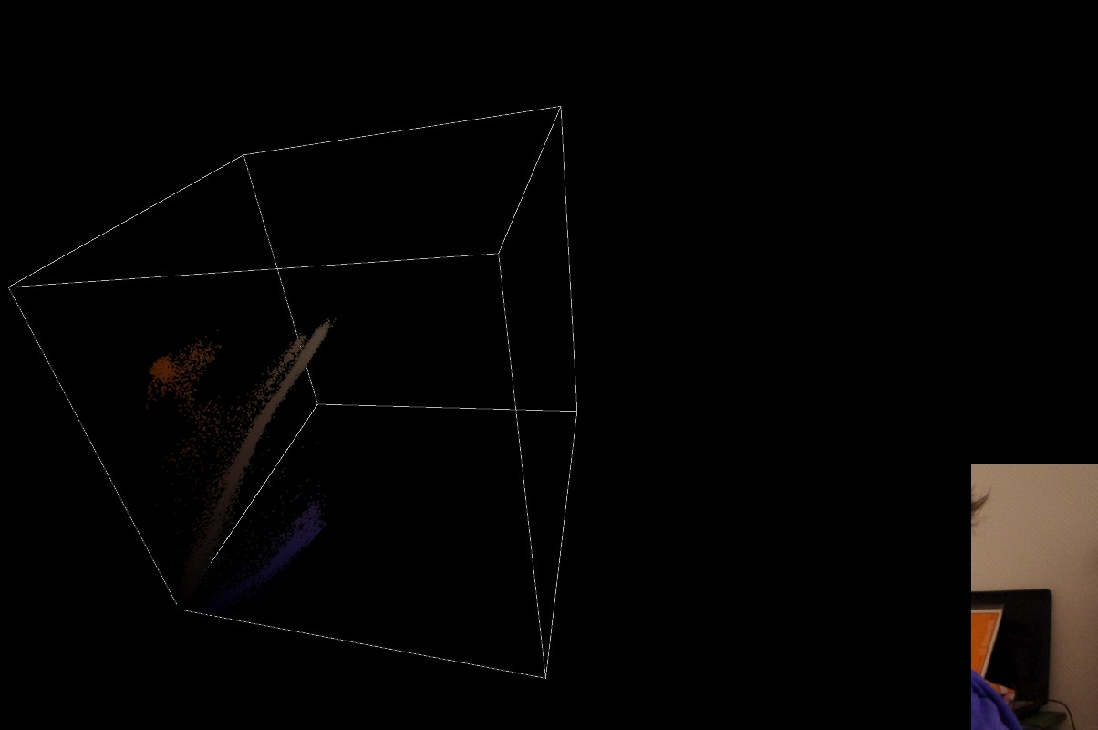 Tout d’abord, un essai d’histogramme dans le cube RVB. Plus une couleur est présente dans la zone choisie de l’image, plus la valeur alpha de la petite sphère représentant cette couleur est forte.