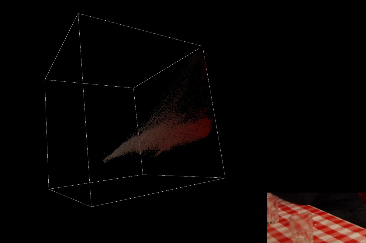 La technique de cartographier les valeurs donne une idée/image de la répartition des couleurs, mais ça n’est pas très pratique de représenter leur « poids » qui constitue la 4e dimension de l’histogramme, notamment puisque les couleurs sombres se fondent dans le fond noir. Utiliser des points blancs + alpha n’aide pas trop, on comprend pas intuitivement à quelle couleur ça correspond. Et puis avec un espace 3D on cache toujours une partie de valeurs…