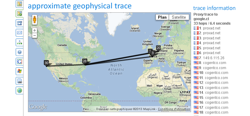 Ainsi pour atteindre Google Chili depuis un ordinateur situé à Angers, on passera par le centre de la France, Francfort, New York pour terminer… à San Francisco où est réellement hébergé l’adresse ‘www.google.cl’. Cinq minutes plus tard, le trajet empruntera les mêmes villes, mais en traversant deux fois l’Atlantique, ajoutant une première étape par la côte Est des États-Unis avant Francfort et retour vers New York. Bien qu’il montre davantage des circuits ponctuels du réseau que sa globalité, visual tracert révèle la situation des points névralgiques du réseau, mais aussi que celui-ci est sans cesse mouvant, modifiant les trajets au gré du trafic.