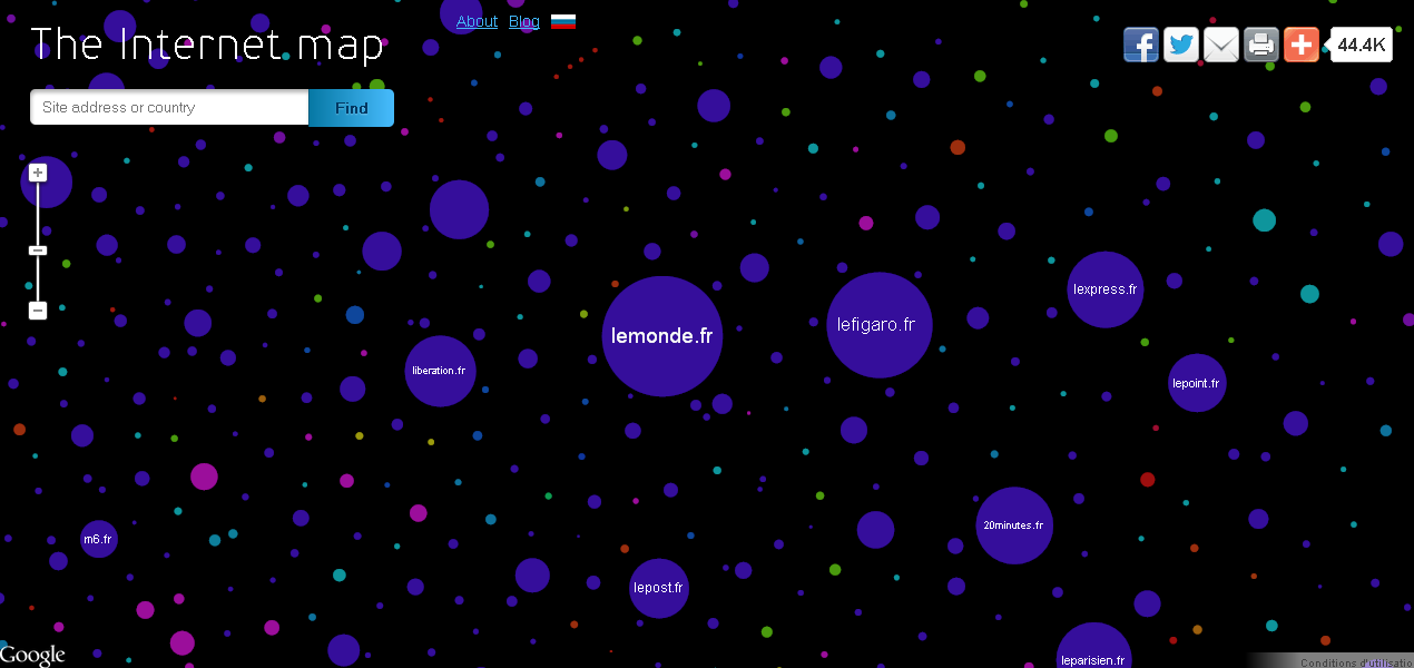 The Internet map propose une carte (au sens d’organisation sur un plan) des différents sites web, représentés par des bulles, en organisant leur position les uns par rapport aux autres en fonction de leur contenu. Ainsi on pourra trouver les grands noms de la presse écrite française regroupés tous à proximité car partageant des contenus d’actualité similaires. Dans le cas présent on pourrait parler de carte sémantique, l’espace étant conçu comme une organisation des contenus thématiques. Le web est alors présenté comme une somme de contenus, de signifiants qu’on peut analyser, interpréter et organiser ; à noter que cette organisation sémantique est réalisée par un logiciel.